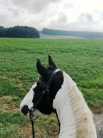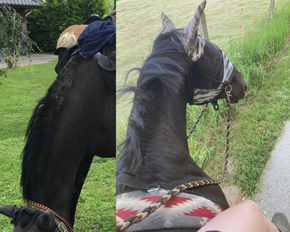 Letztes Jahr hatte er ein sehr starkes Ekzem. Er hatte kaum noch Schweif- und Mähnenhaare. Er hat sich so blutig gekratzt, dass mir die Tierärzte einfach nur Kortison in die Hand gedrückt haben, mit den Worten, dass es nicht sicher sei, ob der Schweif und die Mähne noch mal nachwachsen. Ich hatte eine Decke drauf, aber immer nach dem Ausreiten hat er sich dann auch mit Decke gekratzt.