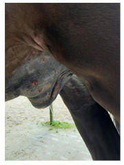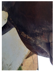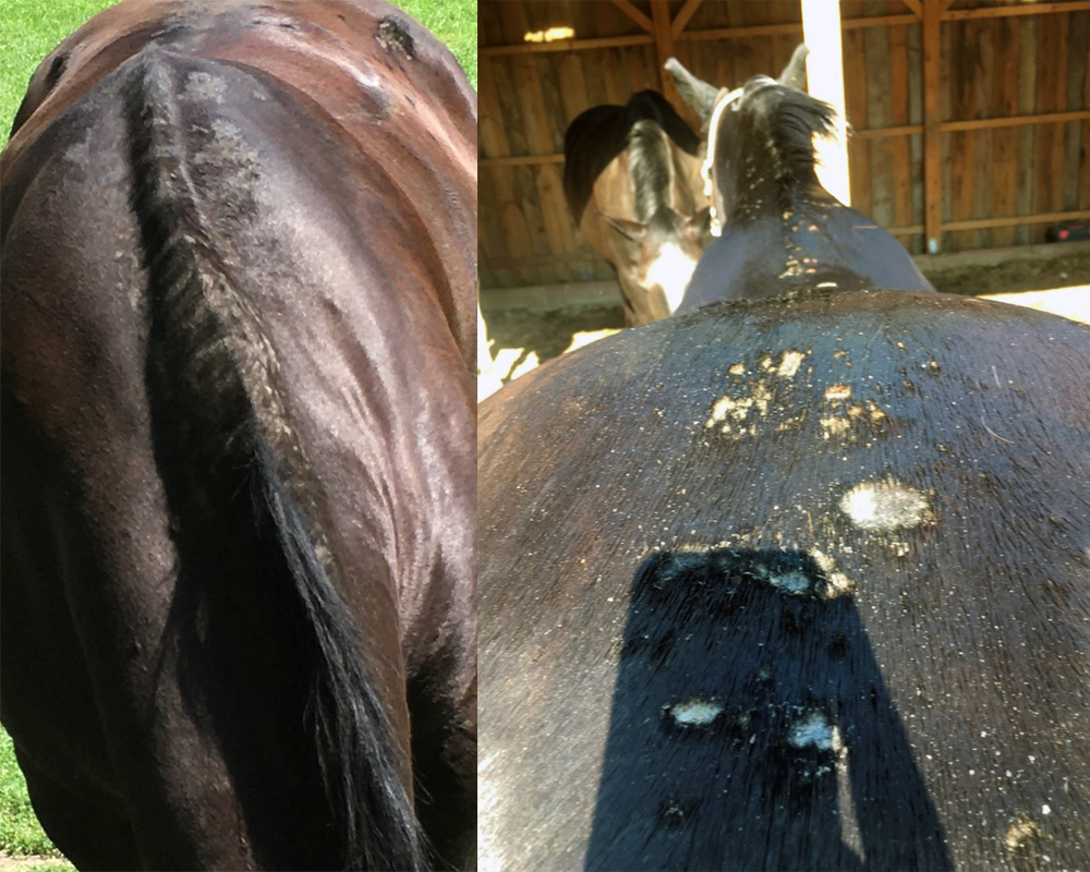 Da wir die Produkte sofort benutzten als wir die Fellveränderung mitbekamen, kam es nie zu offenen, blutenden, schorfigen Stellen. Die Stute scheuerte sich zwar manchmal sehr ausgiebig an allem was hart ist(Selbsttränken usw.) aber nie so, dass alles offen war und das Öl hat kleine Wunden ganz schnell-über Nacht-heilen lassen.