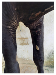 Besonders schlimm ist beim ihm der Mähnenkamm, den er sich blutig schubbert und der schon sehr verhornt war und die Bauchnaht, die teilweise den ganzen Sommer über offen war.