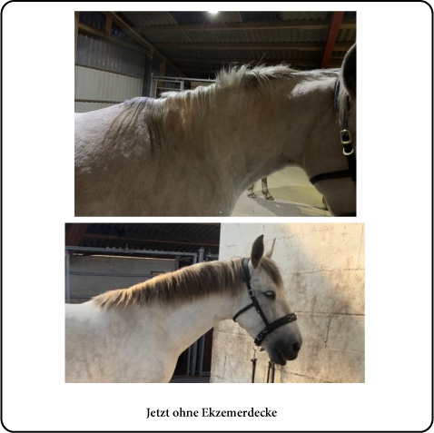 dank eurer Produkte sieht die Mähne von meiner Spanischen Stute wieder richtig gut aus. Sie läuft dieses Jahr ohne Ekzemerdecke auf der Koppel. Dank täglicher Behandlung mit -„ Mich stecht ihr nicht - Forte „ und dem Hautöl  ist bisher kein Juckreiz aufgetreten. Zusätzlich hat sie im Frühjahr die Endogen- Fit Kur bekommen. Nun bin ich gespannt, ob wir weiter so entspannt durch den Sommer kommen.