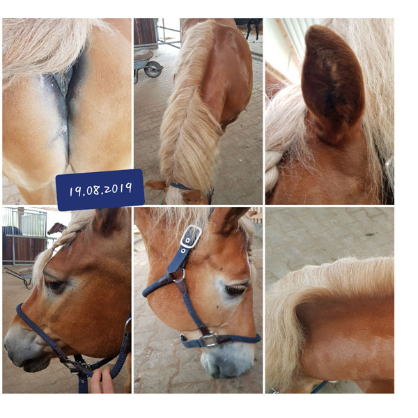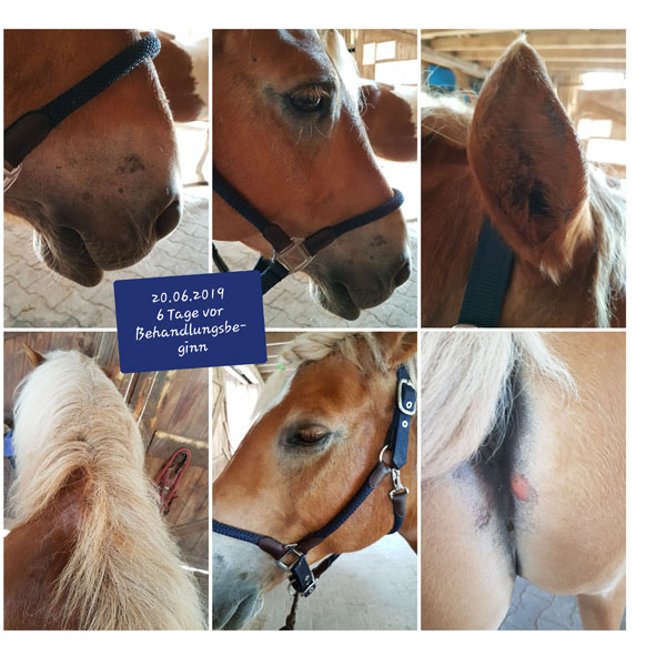 Mein Haflinger Apollon ist 14 Jahre alt und leidet seit mind. 12 Jahren an Sommerekzem (seit ich ihn habe und dem Zustand nach zu urteilen auch schon vorher). Ich würde sagen, mittelschwer. Er steht mittlerweile in einem Aktivstall. Ich habe es durch das Tragen einer Ekzemerdecke und einem guten Pflegemanagement auf ein fast symptomfreies Niveau geschafft, aber das Tragen der Decke hat ihm zunehmend mehr Juckreiz verschafft, sodass ich es Ende Juni mit Ihren Produkten noch einmal gewagt habe. Ich habe das Akutset bestellt und alle Produkte daraus verwendet. Die Decke habe ich in dieser Zeit weiterhin angezogen.